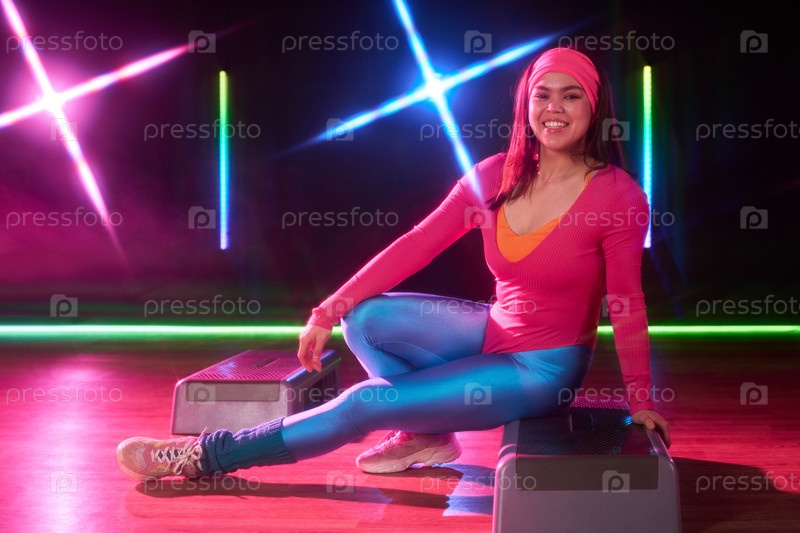 Молодая взрослая женщина улыбается, пока позирует во время тренировки аэробной гимнастики