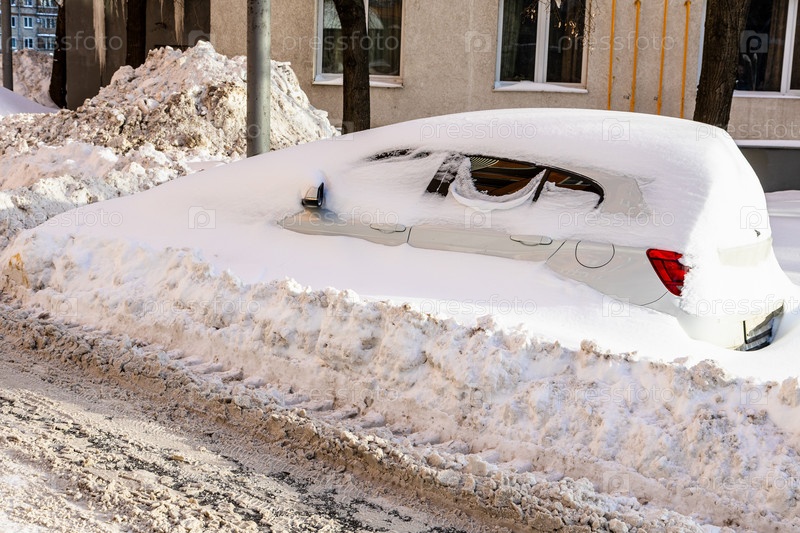 Покрытая снегом машина и грязная заснеженная городская дорога