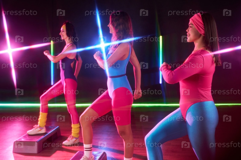 Группа молодых взрослых женщин, занимающихся в ретро фитнес-студии