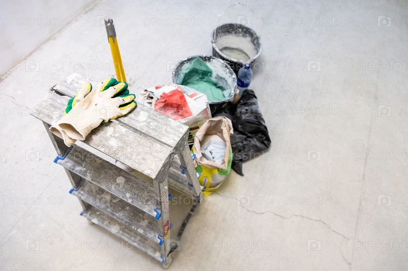 Вид сверху на инструменты штукатурки в бетонном помещении