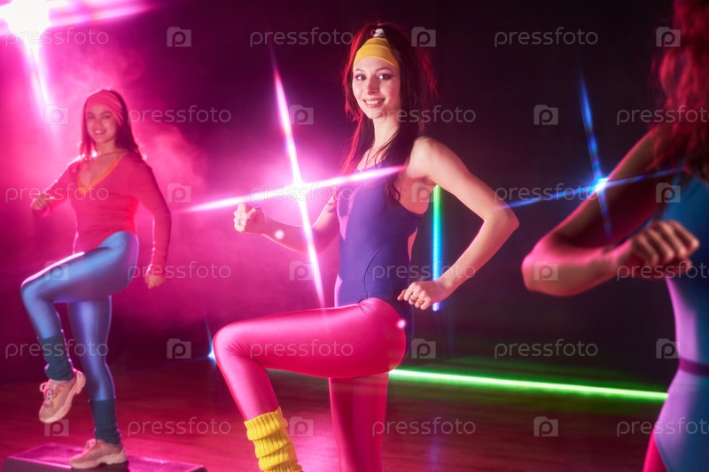 Молодые женщины, занимающиеся в классе аэробики под яркими огнями