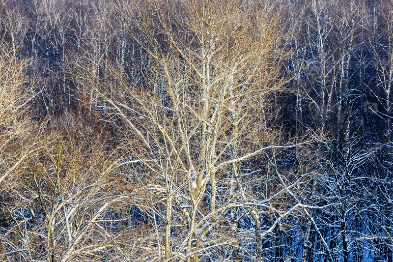 Вид на загоревшуюся солнцем осиновую рощу в лесу зимой