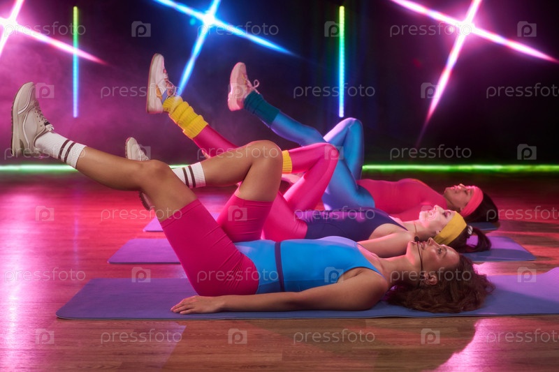 Группа молодых взрослых женщин, занимающихся на ковриках во время Retro Fitness Class