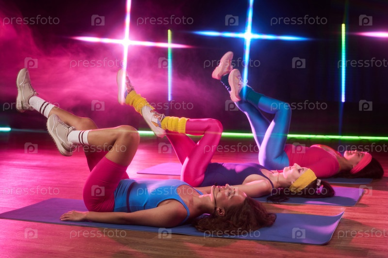 Группа молодых взрослых женщин, выполняющих упражнения на ковриках во время занятий аэробикой