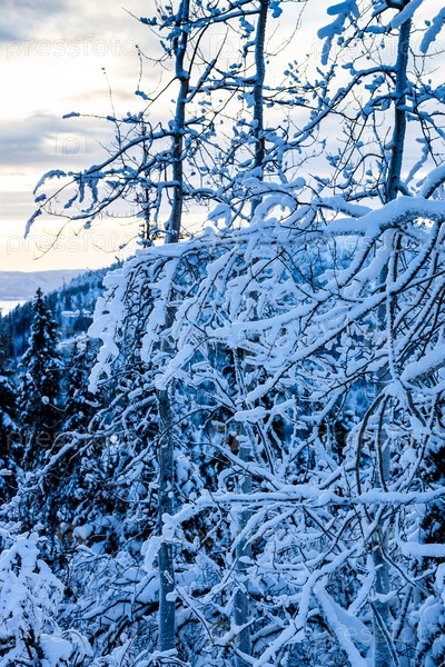Заснеженные ветви деревьев на холме в зимний сумерки