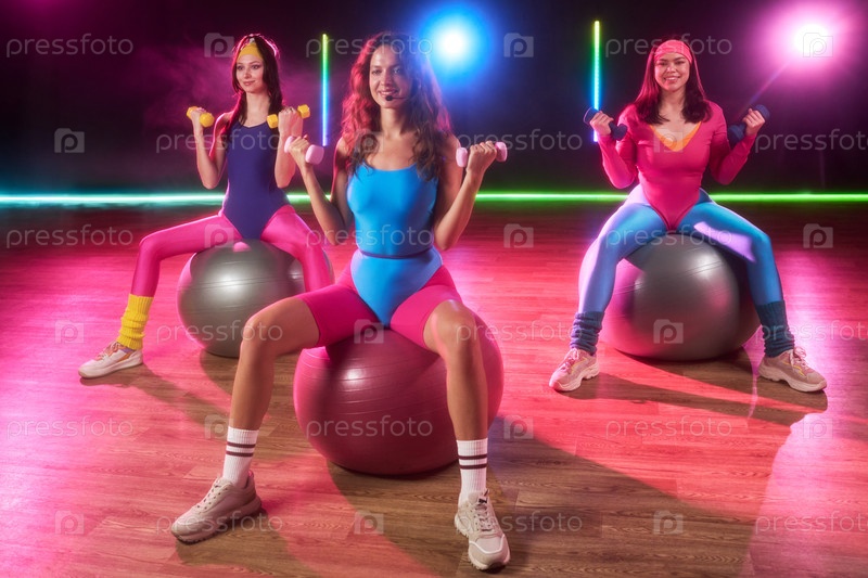 Три молодых взрослых женщины, занимающиеся на фитнес-шарках в аэробической студии