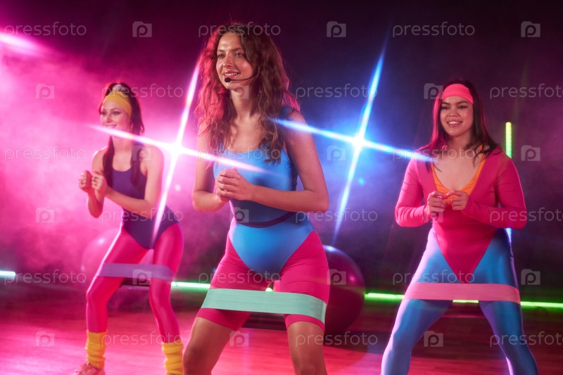 Молодые взрослые женщины улыбаются во время тренировки с группами сопротивления в помещении
