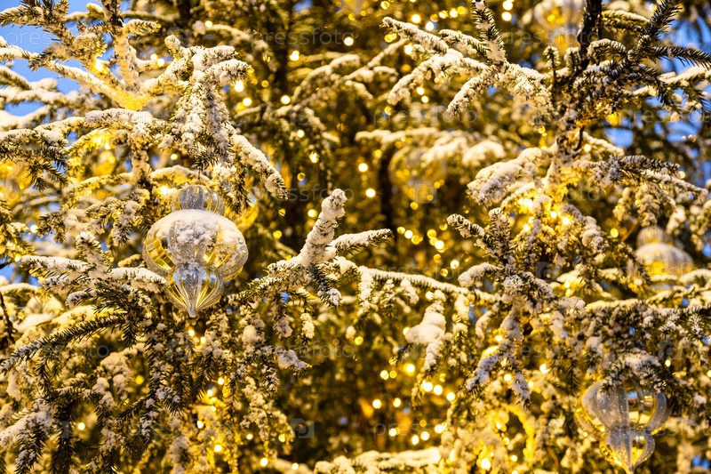 illuminated outdoor snow-covered Christmas tree освещенная наружная заснеженная рождественская елка
