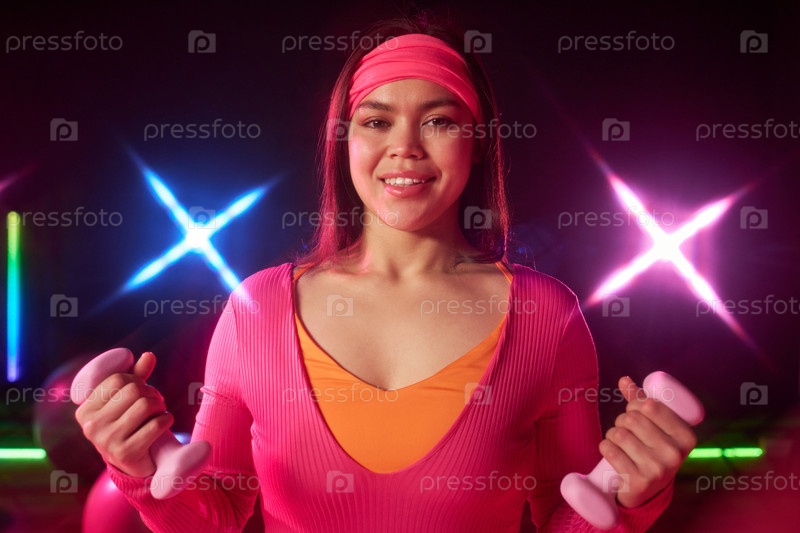Портрет молодой взрослой женщины, улыбающейся во время упражнений на гантели