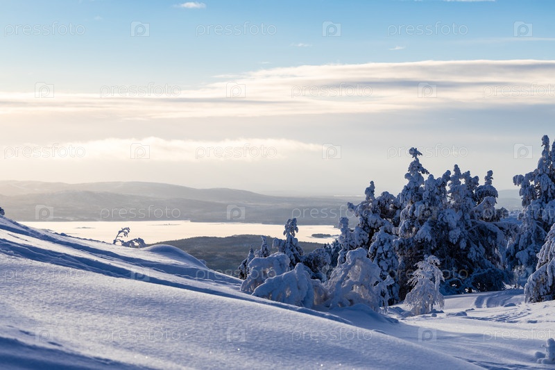 Свыше вид на заснеженный склон холма и залив Кандалакша