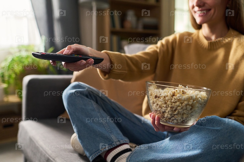 Молодая женщина сидит на диване, смотрит телевизор и ест попкорн