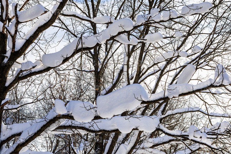 Снежные заносы на ветвях деревьев в лесу городского парка