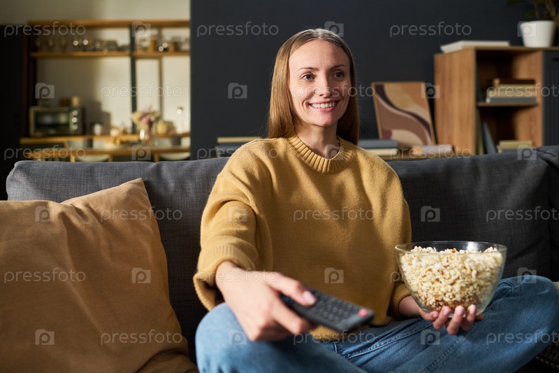 Молодая взрослая женщина смотрит телевизор, едя попкорн на диване