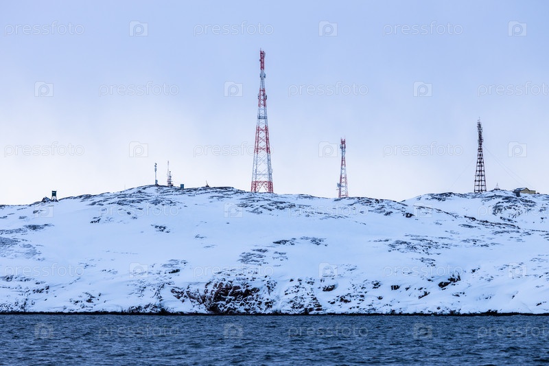 Коммуникационные башни на заснеженном побережье Баренцева моря