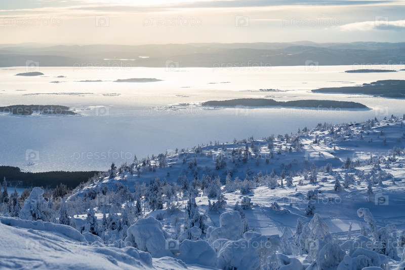 Вид с воздуха на снежный холм и острова в заливе