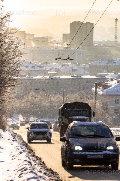 Автотрафик в городе Мурманск в солнечный зимний день