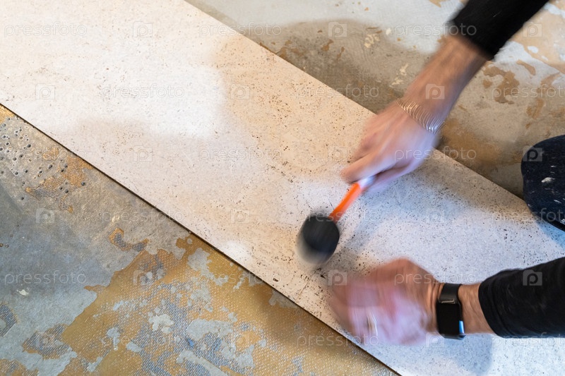 Работник склеивает продольные плитки пластиковым молотком
