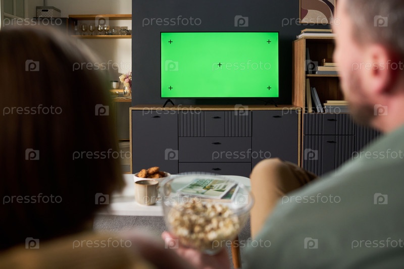 Отец и ребенок смотрят телевизор с зеленым экраном дома
