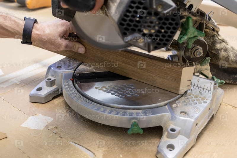 worker saws baseboard with portable circular saw Рабочий пила основной стол с портативной круговой пилой