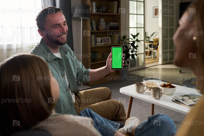 Молодой взрослый мужчина показывает экран смартфона семье в гостиной