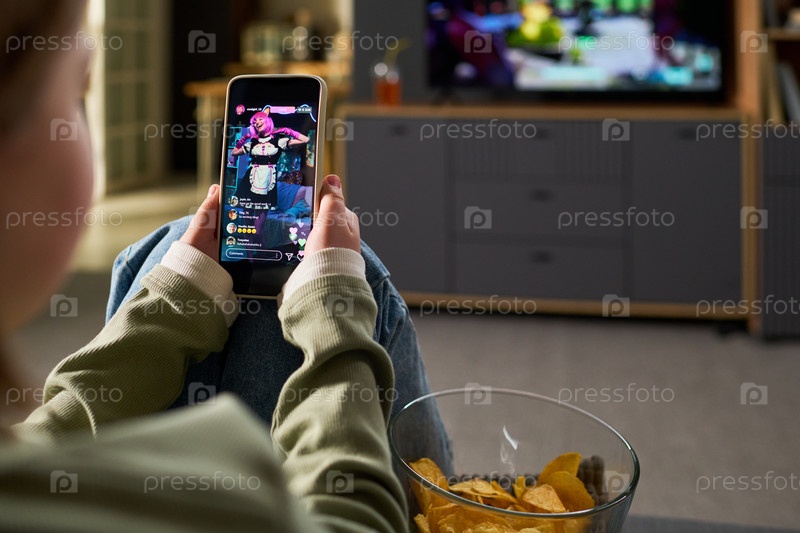 Девушка смотрит прямую трансляцию на смартфоне, отдыхая в помещении