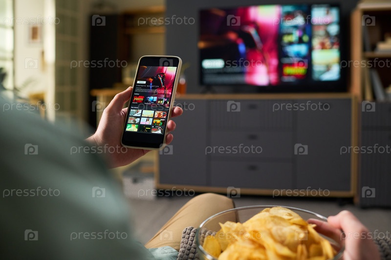 Неизвестный мужчина смотрит стриминговый сервис на смартфоне дома