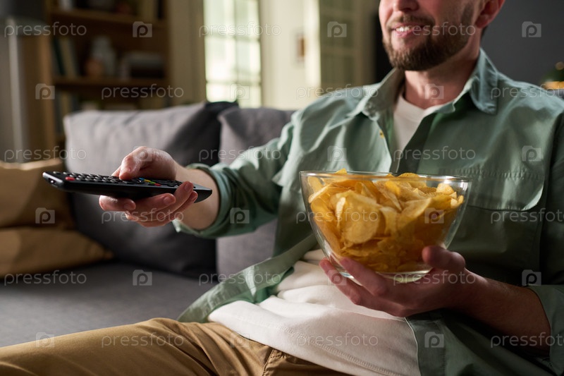 Молодой взрослый мужчина отдыхает на диване, смотрит телевизор и ест чипсы