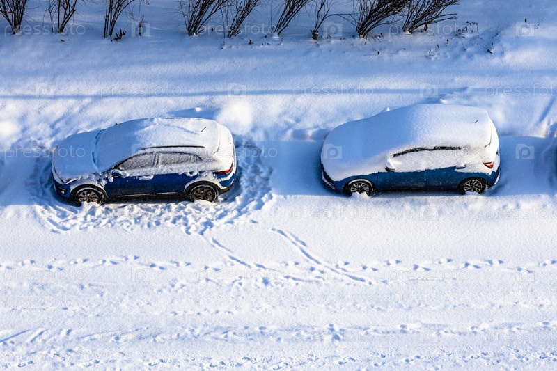 Вид с воздуха покрытых снегом автомобилей возле городского сада