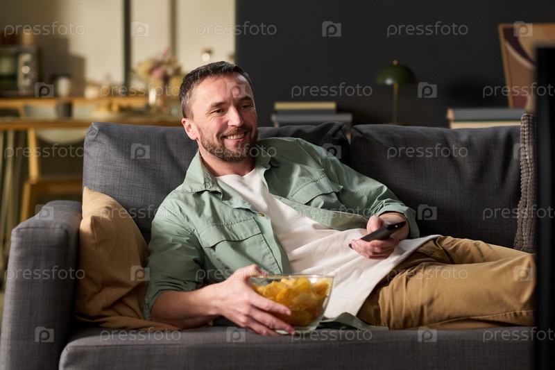 Человек отдыхает на диване, смотрит телевизор и ест закуски