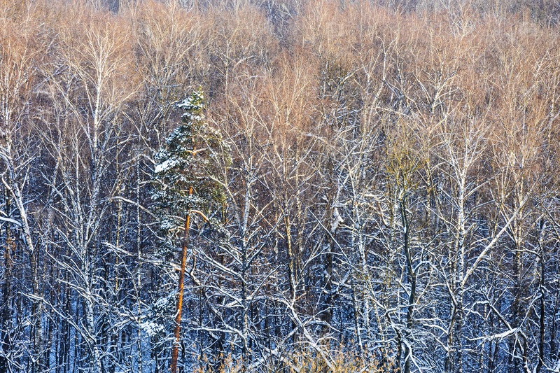 Вид сверху сосны в снежном лесу парка