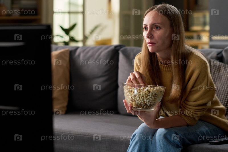 Молодая взрослая женщина смотрит телевизор, едя попкорн в помещении
