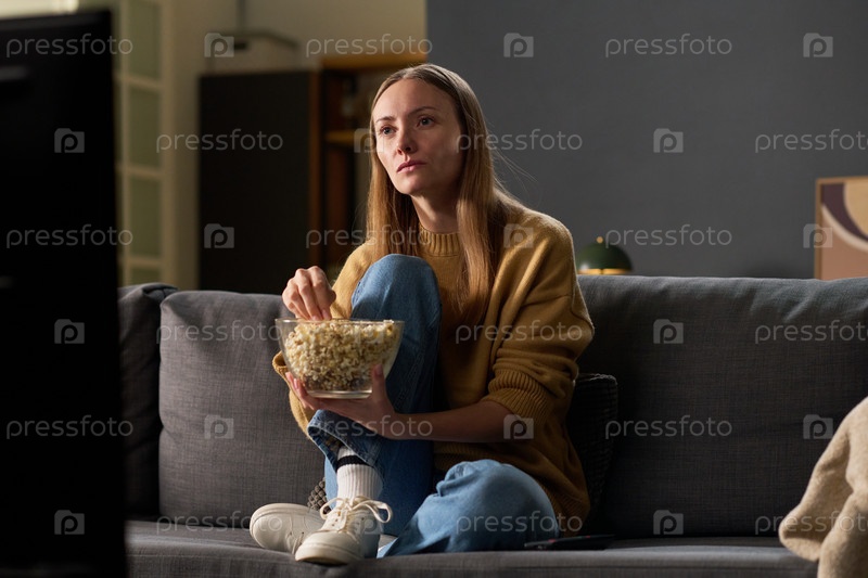 Молодая взрослая женщина сидит на диване, смотрит телевизор и ест попкорн