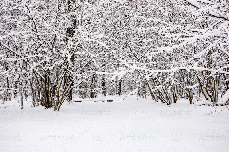 Вид на широкий снежный путь в заснеженном парке
