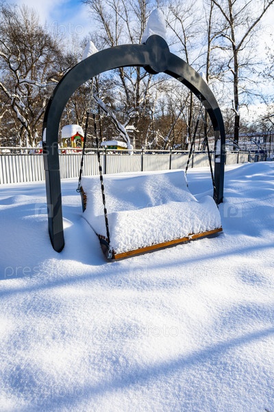 Деревянная качелица, покрытая глубоким снегом в заснеженном парке