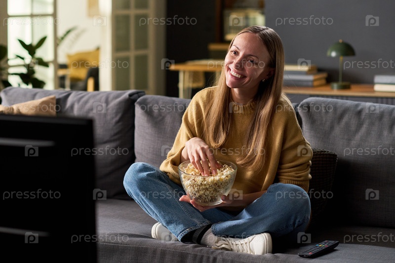 Молодая взрослая женщина сидит на диване, смотрит телевизор и улыбается