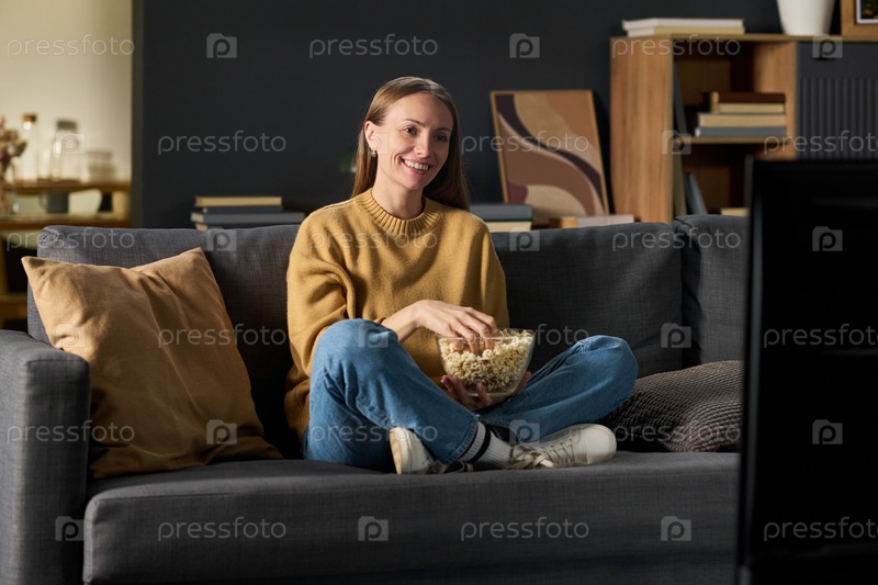 Молодая женщина сидит на диване, смотрит телевизор и ест попкорн
