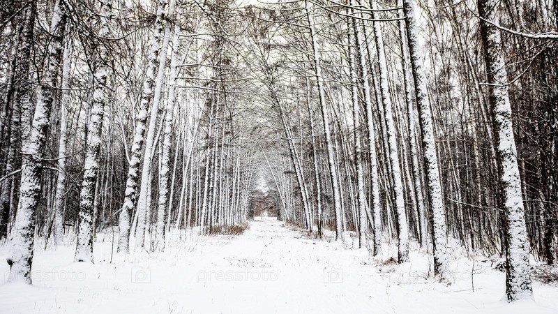 Панорамный вид на заснеженную аллею в ларчевой роще