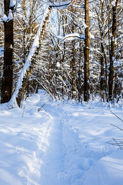 Глубокий путь в снежном лесу городского парка
