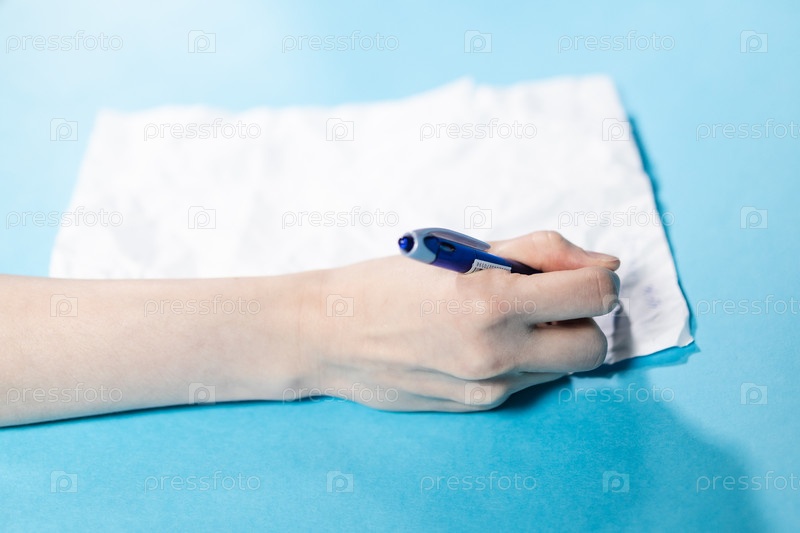 Рукой ручкой пишет на свернутом листе бумаги