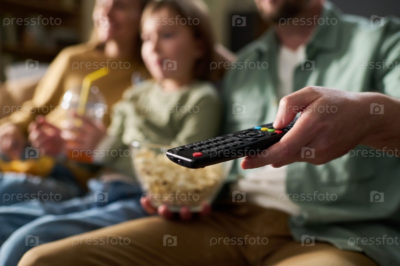 Семья смотрит телевизор вместе, сидя дома на диване