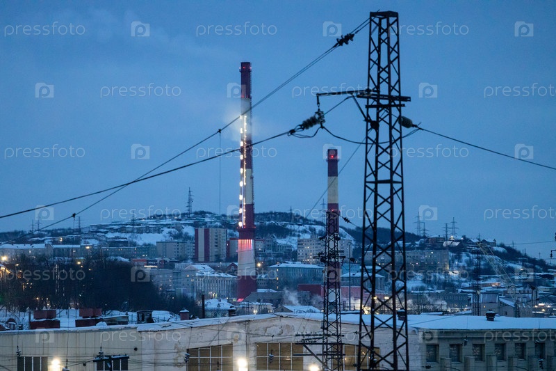 Мурманскский город с дымоходами в голубом зимнем закате