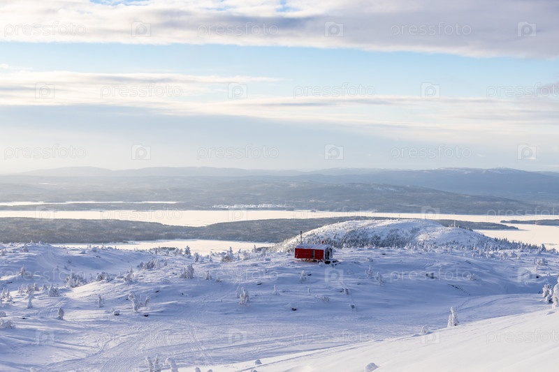 Выше вид на снежный холм с мобильным домом балок