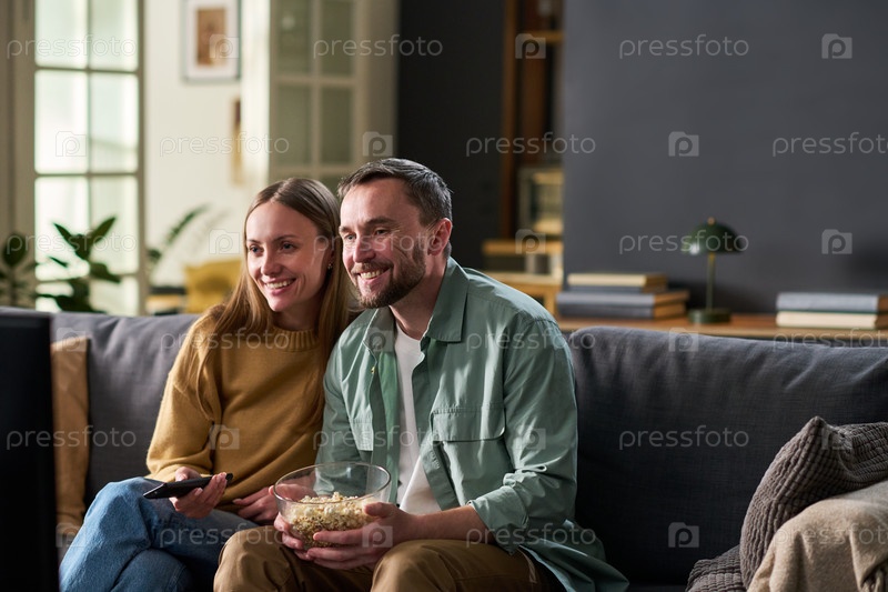 Молодая взрослая пара смотрит телевизор и улыбается вместе в помещении