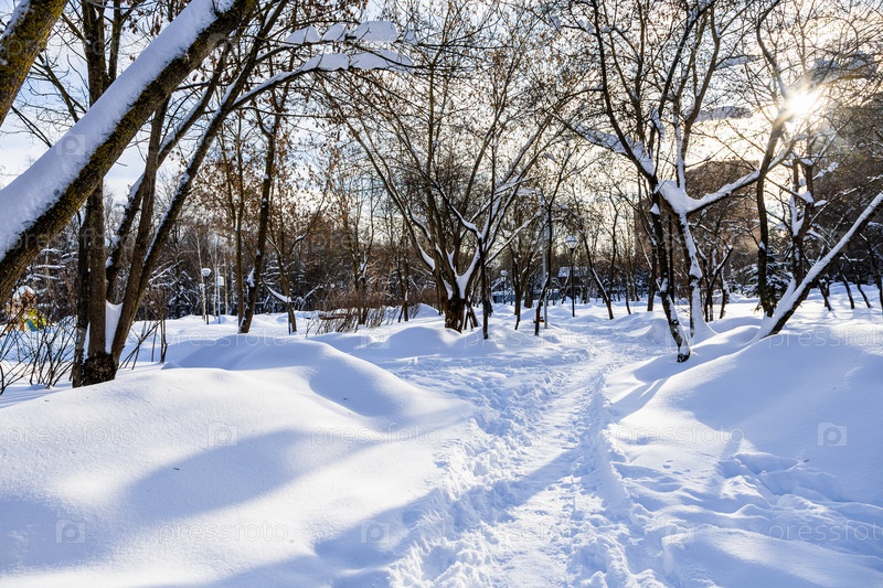 Солнечная дорожка прошла сквозь снежные заносы в городском парке