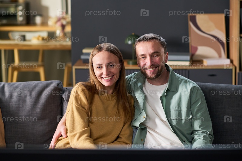 Молодая взрослая пара улыбается, сидя вместе на диване