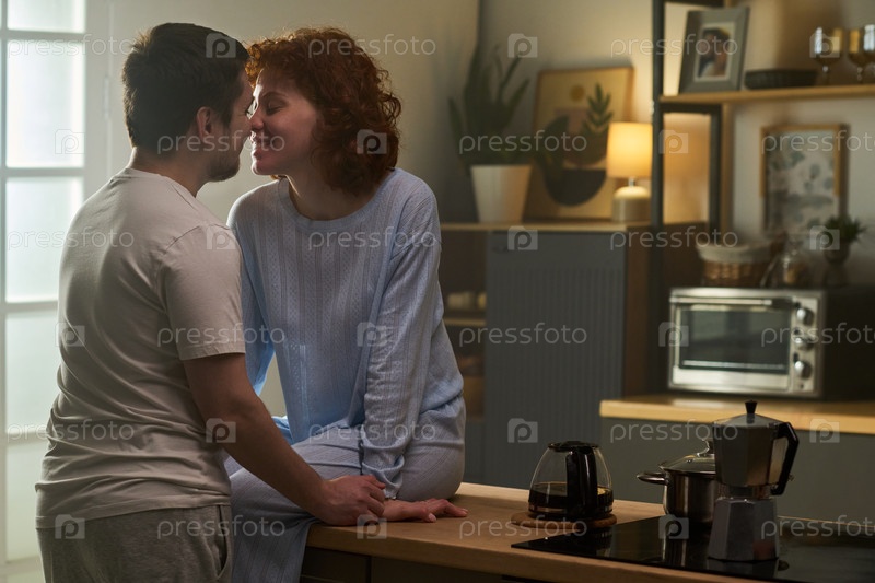 Молодая пара делится интимным моментом в уютной современной кухне