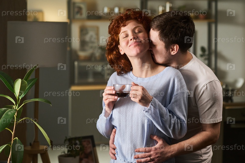 Молодой человек обнимает молодую женщину и пьёт кофе в помещении