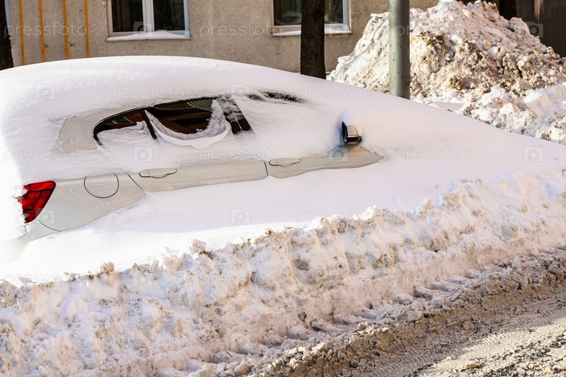 Автомобиль, покрытый глубоким снегом и заснеженной дорогой