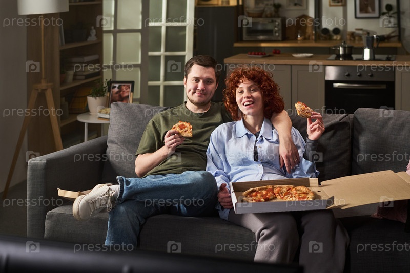 Молодой мужчина и молодая женщина едят пиццу на диване, улыбаясь