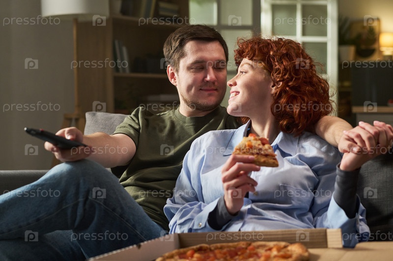 Молодая взрослая пара отдыхает на диване, ест пиццу и смотрит телевизор